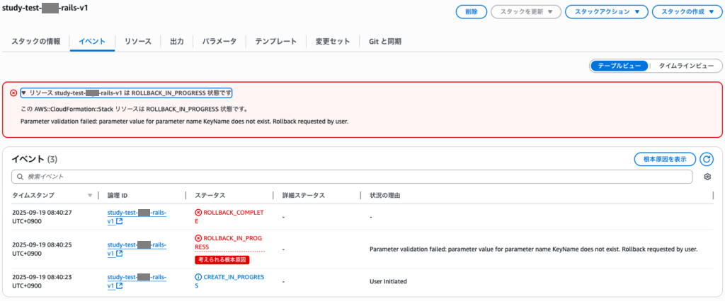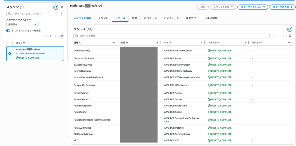 CloudFormationからスタックの削除をおこなうと、作成されたリソースがすべて削除されます。