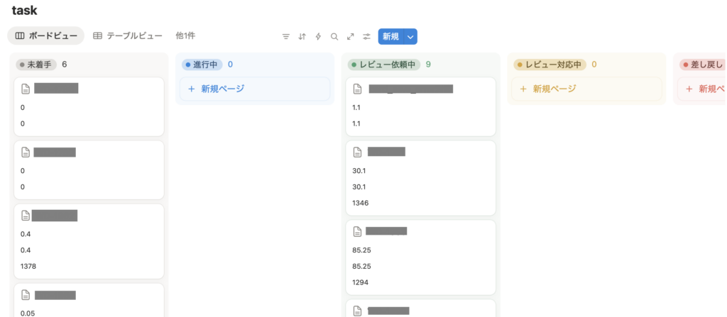 Notionのデータベース機能の一つで、タスクやプロジェクトをカード形式で表示し、ステータスごと(例:未着手、進行中、完了)に列を分けて視覚的に管理する方法です。カードをドラッグ&ドロップすることで、タスクの状態を直感的に更新でき、全体の進捗も一目で把握できます。