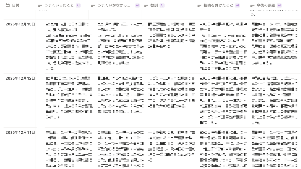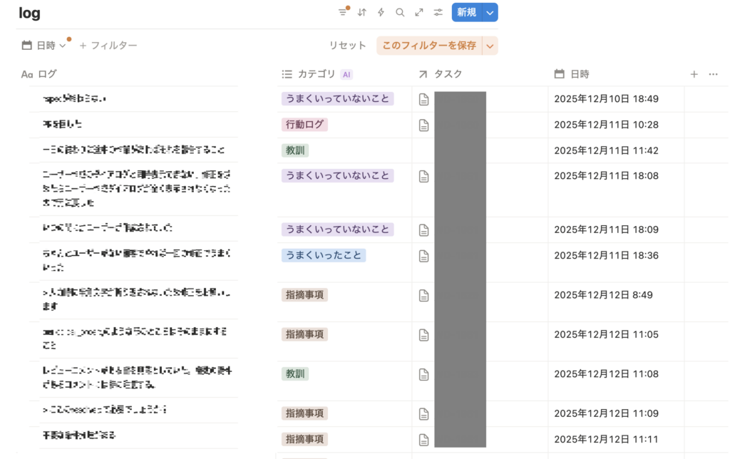 以前はタスクページに直接ログを記載し、その内容をもとにAIで振り返り用のまとめを作成していました。